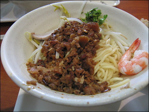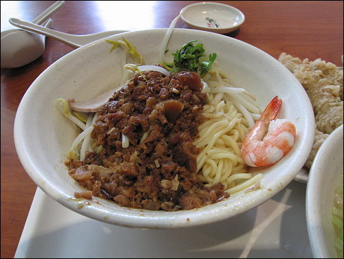 老實說這也是非常貴,不過在這種店,這個價錢難免的,在一般麵攤大概只賣20至25元吧,這是一碗燙油麵林上肉燥,加上一小尾剝殼後的水煮蝦,其實味道是還不錯,就是貴了點。