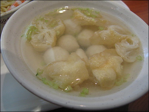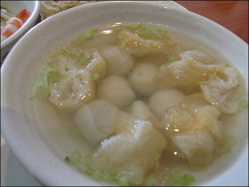一小顆一小顆的魚丸,吃起來滿有彈性的,只是沒什麼味道,湯喝起來頗為清淡,吃玩油炸的,再喝口湯還滿解膩的,特別的是湯內還放了油條,吸了湯汁的軟油條滋味還不錯。