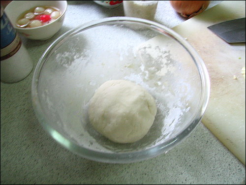 首先使用高筋麵粉,加點鹽巴,用熱水一點一點慢慢加,直到麵糰成形,然後揉至麵糰不黏為止,接著放置一旁。