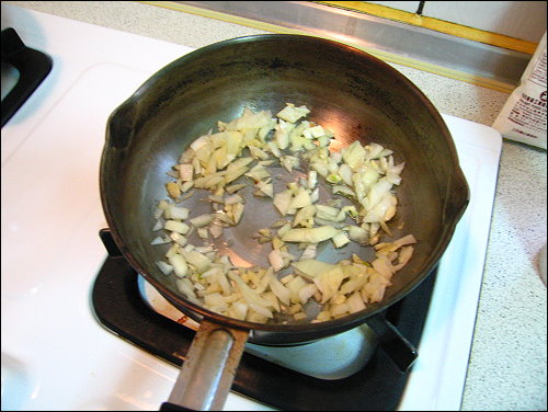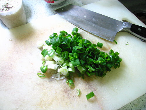 先將蒜頭切碎和洋蔥切小塊,下點油爆香靜置,青蔥切成蔥花備用。