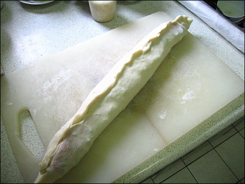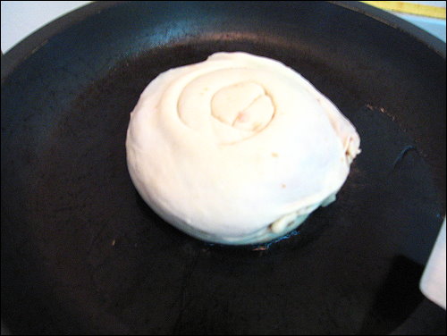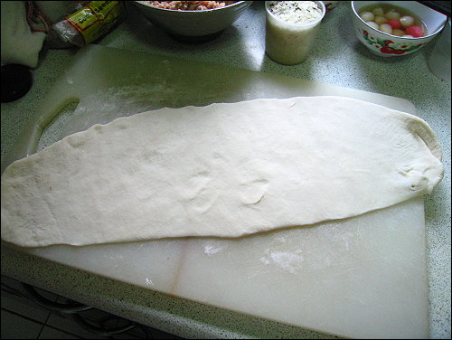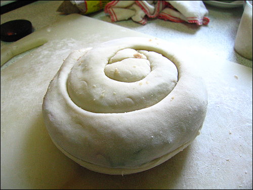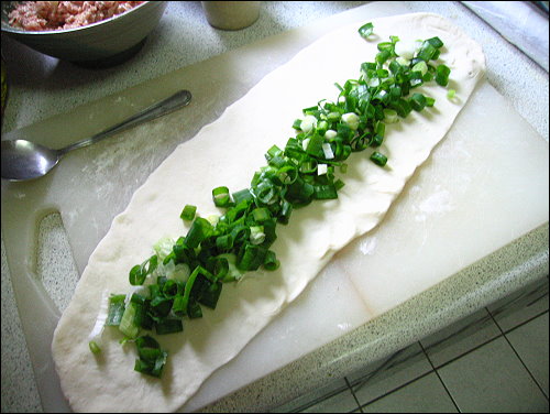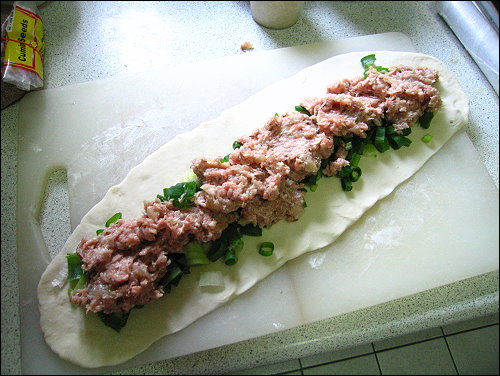 由於餅皮太大了,用一般餡餅的包法應該很難包,所以我突發奇想,用宜蘭蔥餅的包法,將麵糰擀成長方形狀,接著先鋪上蔥花,在將絞肉放上,然後上下兩端包起來捏緊,變成一大長條狀的麵糰,再燒為滾動讓他圓一點,接著將長條麵糰依螺旋的方式捲起來,變成像蝸牛殼一樣的餡餅,不過可惜的是我內餡太多了,麵糰又桿的不太好,最外圈一些麵皮比較薄的地方,內餡都爆了出來,只好盡量補救一下。