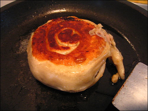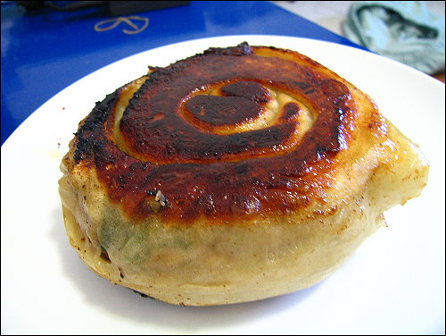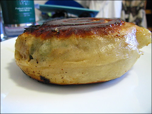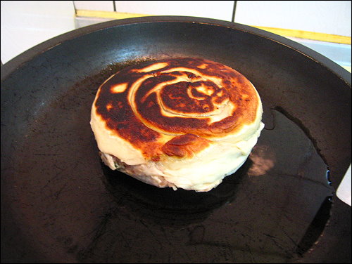 熟了就可以上鍋了,這個巨無霸餡餅比我手掌還大,厚度約有4.5公分,可惜是麵皮包的不好,有點露餡了,湯汁都跑掉了,但好在我是用螺旋狀的做法,所以只有最外層麵皮破掉,而外層的肉汁流掉,內圈的卻還是很完整,孜然的味道非常香,麵皮香Q有嚼勁,不過有些地方會有點太厚,加上這餡餅實在太大了,有點難咬,下次還是考慮做小一點的好了。