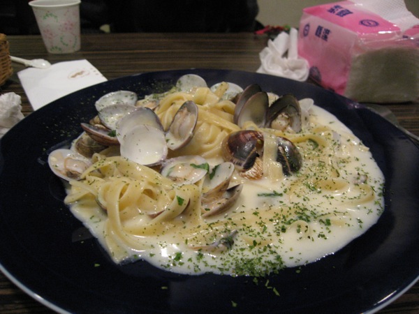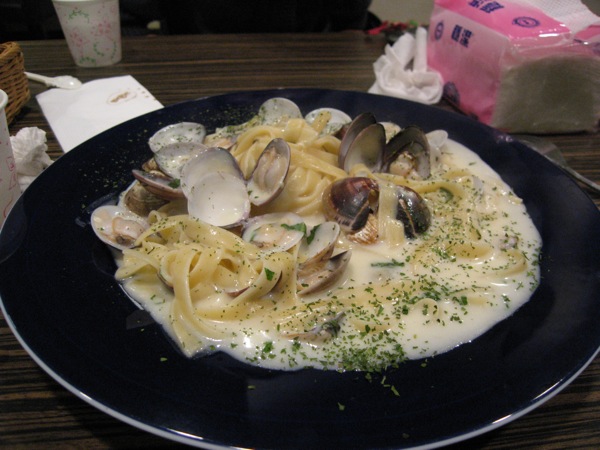 我選擇的是寬麵,我一直覺得白醬口味的義大利麵,選用寬麵吃起來最適合,不過寬麵與一般的義大利麵比起來,每次都讓我覺得份量比較少,醬師傅的麵還是煮的有點軟,不過還在可接受的範圍,而他的白醬相當好吃,奶味很重,而且帶有鮮甜的蛤蜊鮮味,不過有一點太鹹了,不知道是不是因為加了蛤蜊煮,讓原本的白醬變得過鹹,此外白醬中還有碎羅勒,讓白醬湯汁吃起來還帶著羅勒香味,或許是九層塔不是羅勒也不一定,反正氣味很像,蛤蜊頗多,而且肉沒煮到縮掉,吃起來依然相當肥嫩鮮甜,火侯掌握的不錯,麵也有吸進湯汁,吃起來很有味道,以這種平價價格的義大利麵來說,醬師傅或許是我吃過最好吃的了吧!