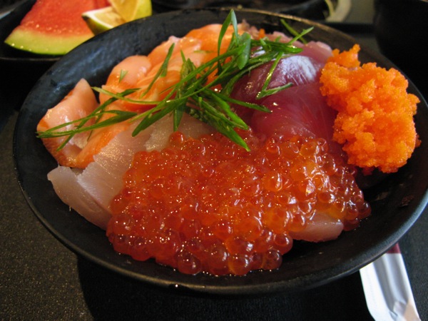 這一大碗生魚片蓋飯上桌,還真是令人驚艷,以198的平價,除了生魚三寶鮭鮪旗魚外,竟然還有大量的鮭魚卵和蝦卵,而在厚又多的生魚片底下還打上了一顆香甜的橙黃土雞蛋。生魚片部分給得相當大方,不但切得厚,數量也多,吃到最後,飯都沒了魚還有剩,而魚肉的新鮮度也不錯,口感扎實,滋味甜美。不過比較令人覺得怪異的是所謂的特製醋飯,其實就是熱白飯加壽司醋攪拌,熱熱的醋飯老實說並不是很好吃,酸酸的醋味相當明顯,有些刺鼻,這是美中不足的地方,如果在熱白飯或是冷醋飯之間擇一,也好過這熱醋飯的怪異來得好,除了蓋飯外,還附上了水果與味噌湯,此外飲料也是無限暢飲的,有熱茶也有冰飲,老實說,以198的價格可以吃到如此豐富的生魚片蓋飯,加上附贈的餐點,真是相當的划算啊!