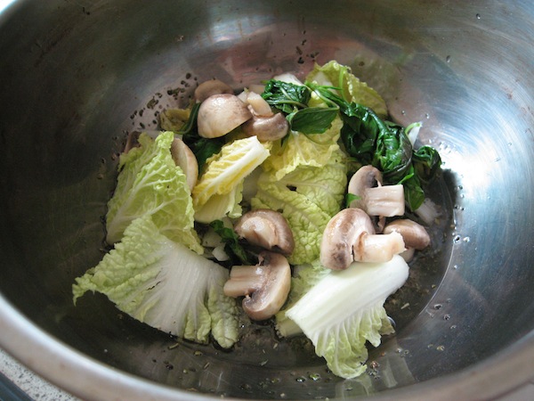 蘑菇切半燙熟備用,如果不敢吃生的九層塔的話,也可以熱水稍微燙一下,洋蔥和美生菜洗好切好泡冰水後,瀝乾備用。