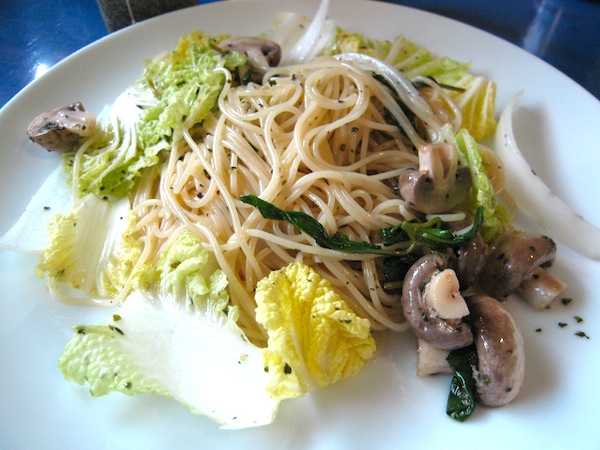 天使細麵煮熟後,泡冰水放涼,將剛剛準備好的食材與細麵放入泡好的香料橄欖油中攪拌均勻即可。