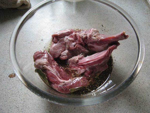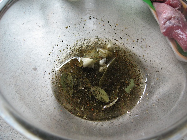 首先準備醃漬羊排用的香料油,拿一調理盆,放入義大利香料、羅勒葉、月桂葉、海鹽、胡椒粉後,再倒入橄欖油和少許白酒,放置約一小時讓香料油入味。
