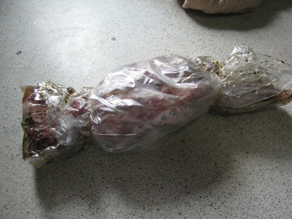 如果有密口袋的話,將羊排和香料油放進密口袋中,空氣擠出放入冰箱醃漬一整天,沒有密口袋的話,用塑膠袋也可以,同樣把空氣擠乾淨。