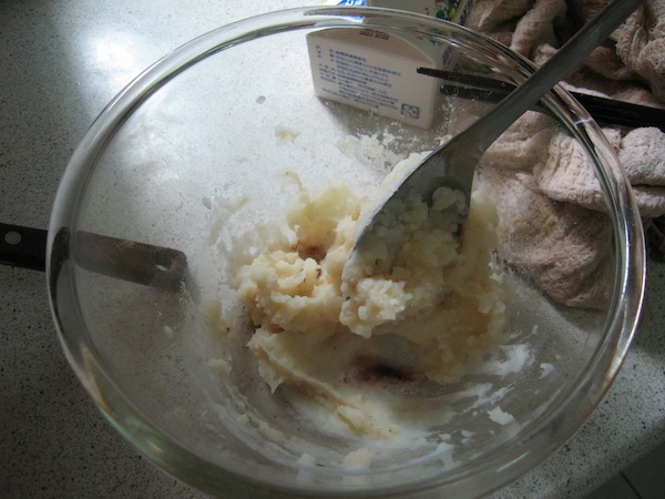 趁在煎羊排的時候做個簡單的馬鈴薯泥,馬鈴薯削皮切片後,放入電鍋中蒸熟,接著拿出來放入調理盆,灑入海鹽和少許奶油、牛奶,攪拌均勻即可。