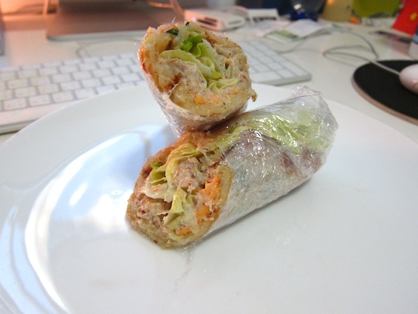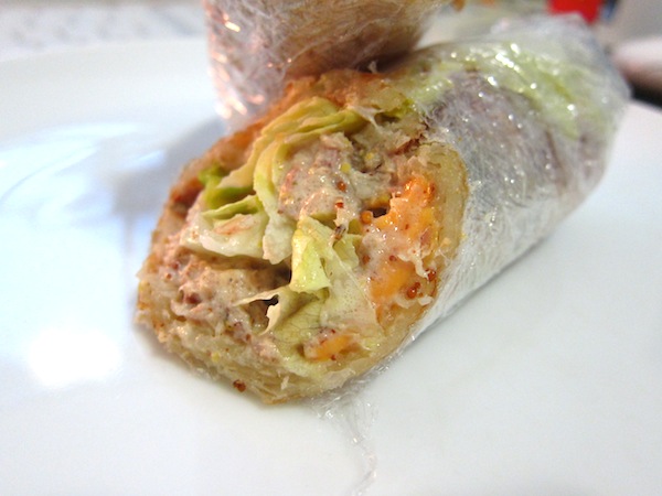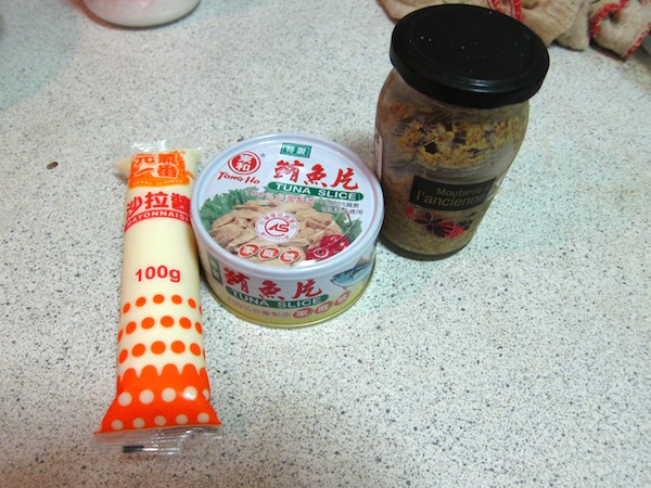 捲餅的作法很簡單,可捲的食材也很多,這次用的是鮪魚醬,搭配微酸的芥末子調味。
