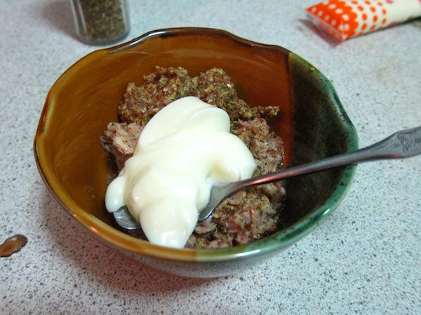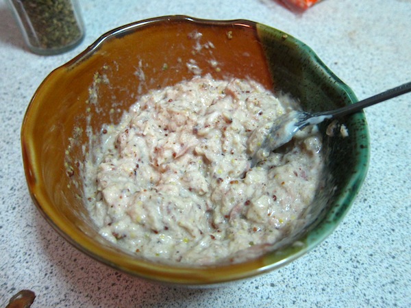 半罐鮪魚片倒入碗中,加入芥末子醬大約三匙,灑入少許胡椒粉、海鹽,接著加入沙拉,攪拌均勻即可。