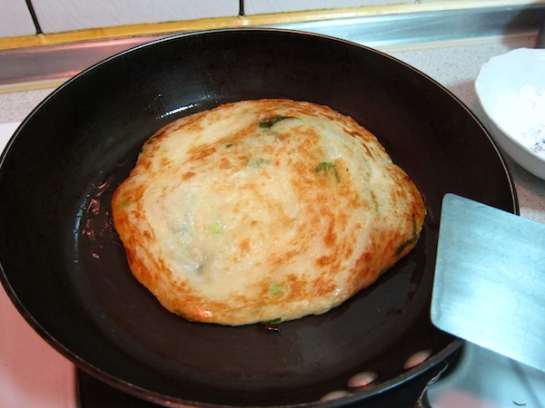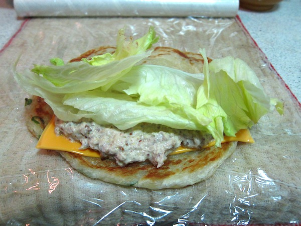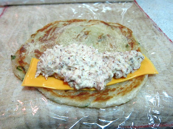 餅要放涼的原因在於要用保鮮膜包起來,太熱的話保鮮膜會融化,保鮮膜鋪在底下,將蔥抓餅放在保鮮膜上,灑點胡椒粉,放上一片對切兩半的起士片,再將剛剛調好的鮪魚醬抹上去。