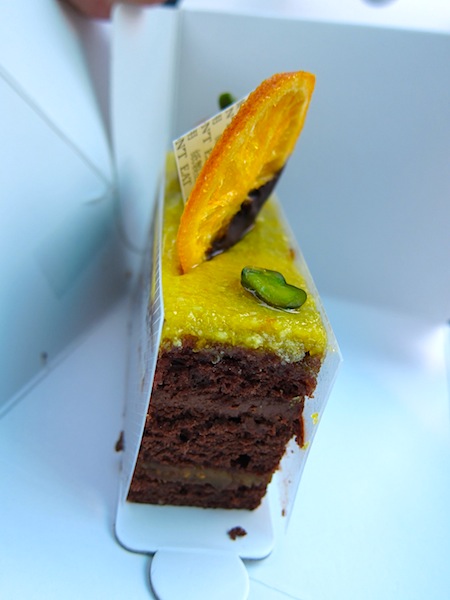 因為坐在車上吃,很難拍照,只好隨手拍了這兩張。我選的費加洛巧克力,上面有一片香橙糖片和栗子,都香甜好吃,蛋糕本體吃起來是濃濃的巧克力味,帶點柳橙的甜酸,不過還是巧克力味佔大宗,較為明顯的就是這兩種味道。在口味的層次上,覺得較為單薄了點,不過口感濕潤香甜,還是不錯,就是沒那麼驚艷,還是覺得初訪吃的綠洲較好吃。