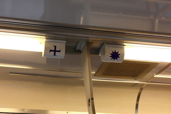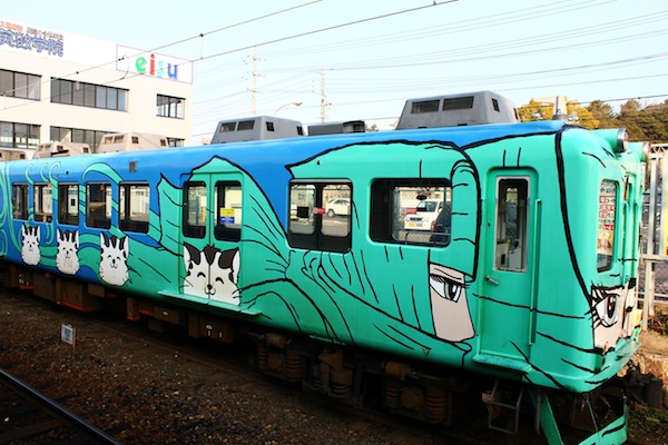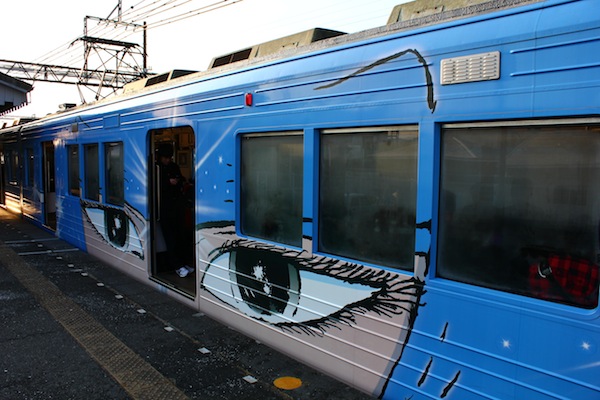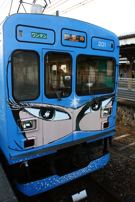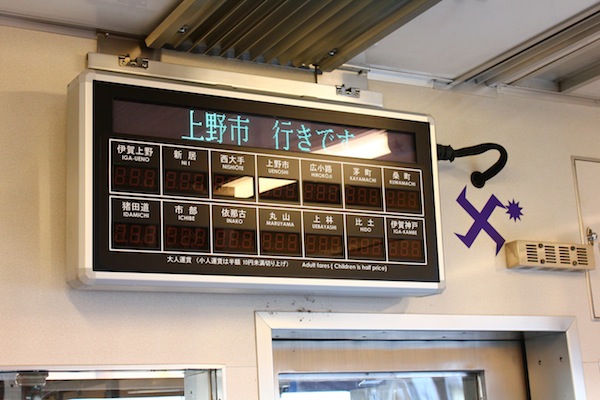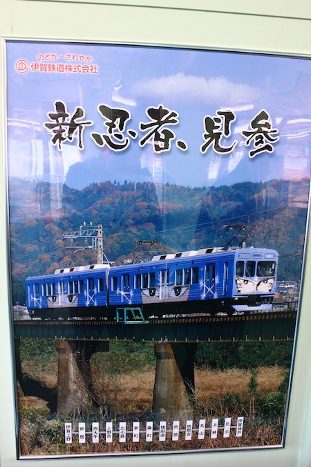 到了伊賀神戶站,忍者的要素就出來了。首先入目的就是彩繪成忍者塗裝的伊賀鐵道忍者列車,有好幾種顏色和主題,我乘坐的是藍色,另外還有紫色和綠色的。車頭飾一個忍者的臉,眼睛卻是水汪汪的少女漫畫風格,但又不失銳利的眼神,很趣味。車廂內的裝飾也有濃濃的忍者風情,有許多忍者手裡劍圖案的彩繪。車內的電子看板會提醒現在列車到達哪一站了,所以不用擔心會坐過站,不過列車只有兩節車廂而已,應該是乘載量小吧!不過我來的時候剛好遇到一群學生要去上課,應該都是要去上野市吧。