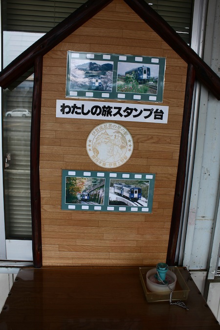 車站的月台上有旅行的蓋章可以蓋,也是有關伊賀忍者的圖章,在日本,這種蓋章的觀光設施真的很多,而且日本小朋友都會去收集,我也蓋了一個章,找不到紙,只好拿出發前列印出來的電子機票,蓋在背後。之前不知道在哪個景點,好像看過日本遊客拿一本旅行蓋章專用的本子,這個東西不錯,以後來日本應該帶一本的,因為日本到處都有蓋紀念章的設施。