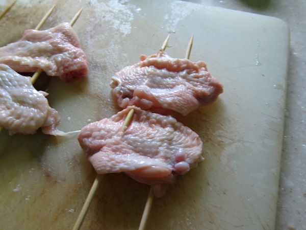 首先處理雞翅,將二節翅的中段洗淨之後,翻過來,也就是背面,用刀從兩根骨頭中切開,切斷兩根骨頭上下連接處,要小心不要連前面的皮都切開,然後從切開的背面連皮帶肉往兩旁翻開,拿竹籤從皮與骨頭之間串過去,這樣不管是正面還是背面的雞皮都會在正面,背面則是變成敞開的樣子,烤起來也比較快熟。在京都吃烤手羽先的時候,發現日本串燒好像都是這樣處理雞翅的,所以偷學一下。