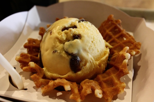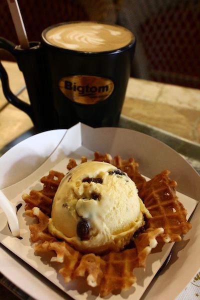 單球冰淇淋是用花籃餅乾裝著,餅乾非常香脆,帶了一點鹹味,剛好與冰淇淋的甜中和。Bigtom的蘭姆系列向來是我最愛的口味,有蘭姆葡萄和櫻桃,使用蘭姆酒釀過葡萄,帶著淡淡酒香味,搭配口感黏稠而帶有嚼勁的冰淇淋,相當好吃,雖然Bigtom的冰淇淋是減脂減糖,不過對我來說,還是稍微有點甜,所以配個微苦的咖啡吃會比較剛好。