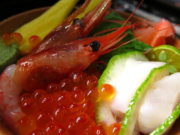 漁陶屋的三色丼是牡丹蝦、干貝和鮭魚卵,干貝與牡丹蝦各二,而干貝夾著檸檬片,飯使用醋飯,牡丹蝦相當鮮甜,不過蝦膏稍微有點腥。干貝可搭配檸檬片一起吃,不過檸檬片太酸,會把干貝的甜味掩蓋,所以後來我就把檸檬片挑掉,只吃干貝也頗甜。鮭魚卵的調味適中,整體而言,是品質與新鮮度都不錯的丼飯。