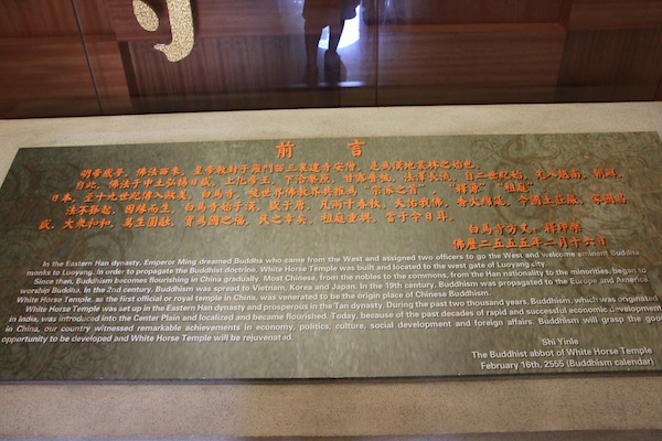 白馬寺的興建由來是這樣的,東漢明帝有一天晚上做了一個夢,夢中他見到一個全身金身,頭發白光的神,隔天起床後他跟大臣說這個夢,並問這個神是何方神聖。此時一個見識淵博的大臣說這應該是天竺的佛,漢明帝很高興,便遣人去西域求佛。歷經三年,請回兩位天竺僧人迦葉摩騰和竺法蘭,並在洛陽東郊興建白馬寺。從此白馬寺便成為中國佛教的起源地,有釋源與祖庭之稱。白馬寺的建築宏偉壯觀,但歷代以來幾經戰亂,幾度興衰。現存的建築大多為明清兩代所建。