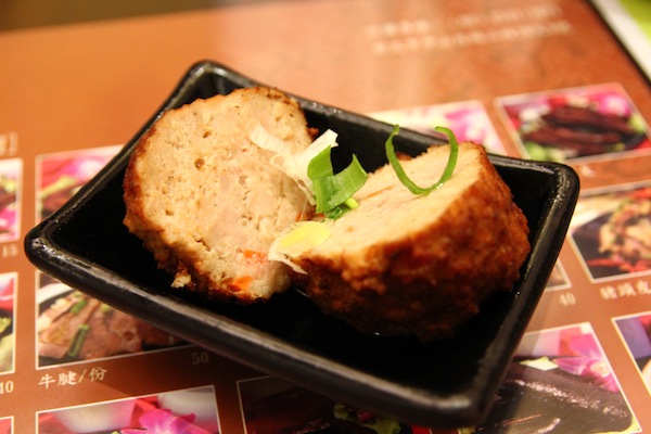 獅子頭是以乾的形式呈現,外皮應該是先有炸過定型再以紅燒的方式處理,吃起來蠻重的蔥薑味,荸薺爽脆的口感也很明顯。不過我比較不偏好這樣的獅子頭,我喜歡吃的是燉煮得口感棉軟、入口即化的獅子頭。記得去大陸時,在揚州吃的蟹粉獅子頭,真是迷人的美味。