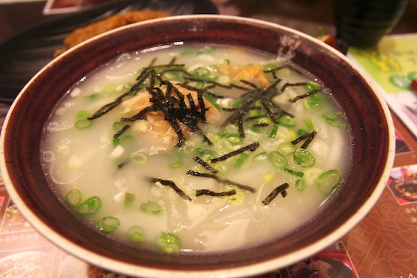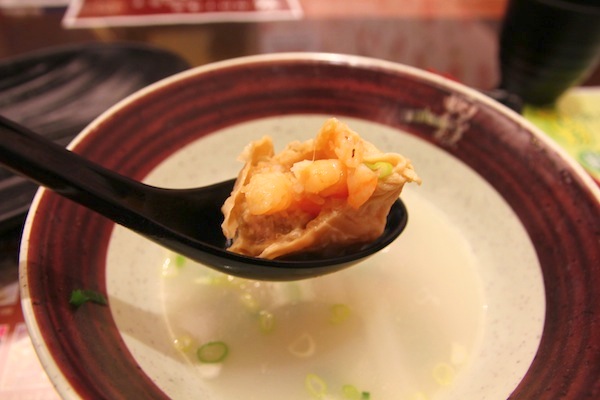 看到這湯頭顏色,果然是相當大陸風味的小吃,大陸的湯麵大多是這樣白濁色的湯頭。雖然湯頭看起來很濃郁,不過喝起來倒是相當清淡。湯裡的粉絲是以純綠豆製作,但與冬粉不同,做成的粉絲有如米苔目般的粗細,顏色則是半透明,口感軟中帶點彈性,這在台灣是不常見的食材。千張包子即是使用千張,也就是豆腐皮包餡料,看起來有點像餛飩,但吃起來卻是豆腐皮較粗的口感,內餡飽滿,帶著一整隻蝦仁,相當特別的小吃。