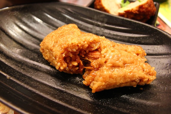 長條形狀的湖州粽子,與台灣的南部粽、北部粽大不相同,也可稱作外省粽,台灣本省人似乎是不做這樣的粽子的。這湖洲粽子味道不錯,,糯米十分黏軟,內餡包著瘦豬肉,帶著粽葉香氣,相較於臺北南門市場的湖洲粽,丁春芳的比較不油膩,內餡也沒什麼肥肉,這樣吃起來雖然比較清爽不膩,但也少了一點油香感呀,有利有弊。