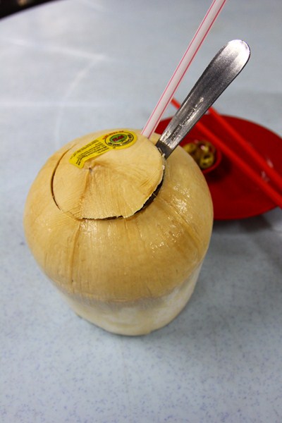 在亞庇喝了椰子水覺得很棒,來這也點了一個。這裡的椰子水雖然也很甜,不過好像還是沒亞庇的好喝,而且裏頭的果肉都沒了,倒是蓋子上有一層果肉。