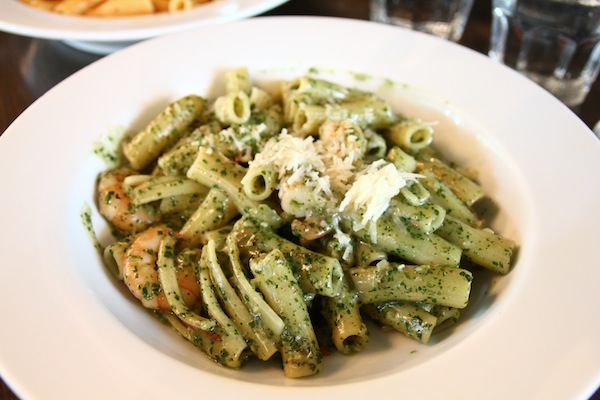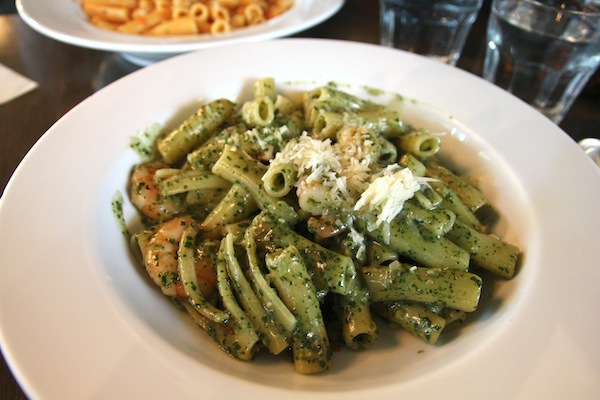 義麵坊提供兩種麵條:細直麵與管麵可供選擇,每一種麵都有推薦使用的麵條,我選的鮮蝦香料麵推薦使用管麵,雖然我沒很愛吃管麵,不過既然是推薦的,也就隨著點了。說是香料麵,其實就是青醬口味,加上蝦仁,量還挺多,不過有些單調,只有蝦仁與青醬管麵。管麵煮得稍嫌軟了些,口感不夠,青醬雖然濃郁,但也有些膩口,或許是因為有加鮮奶油的關係,膩了些,近年來我對青醬義大利麵的喜好,偏向於不加鮮奶油,只單純用羅勒製成的橄欖油青醬與義大利麵拌炒出香味。不過這裡的麵倒是吃得挺飽。以這價位來說,算是學校商圈內相當平實的選擇。