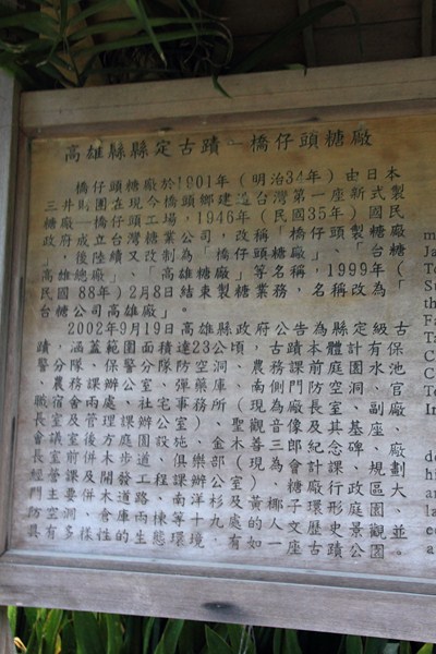 橋頭糖廠建於1901年,當時仍是日本殖民台灣時期,其實早在清朝時,橋頭便是台灣產糖重鎮,只是當時還是以傳統的製糖方式來製糖,日本據台後,建造橋頭糖廠,為台灣第一座新式機械糖廠,在光復後則成為台糖公司的高雄廠。橋頭糖廠於民國八十八年時停止使用,如今規劃成台灣糖業博物館供民眾參觀,在門口還可看到偉大的領袖老蔣的半身像,想必是台灣光復後所擺放的。