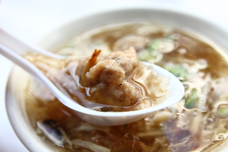 肉羹則是使用赤肉裹漿所制,同樣是相當具有彈性。而羹湯的味道則是偏甜,加了烏醋所以也帶些酸味兒。