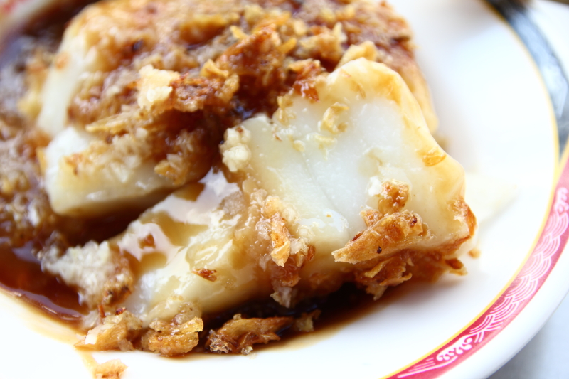 白嫩嫩的粿淋上甜膩的醬油膏,再撒上大量的油蔥酥,看起來賞心悅目,本來以為粿是熱的,沒想到竟然是涼的。