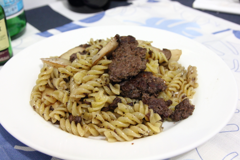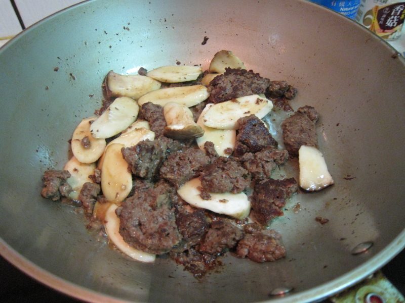 加入煮熟的螺絲麵拌炒,加點煮麵水增加水份,灑點鹽調味即可起鍋。