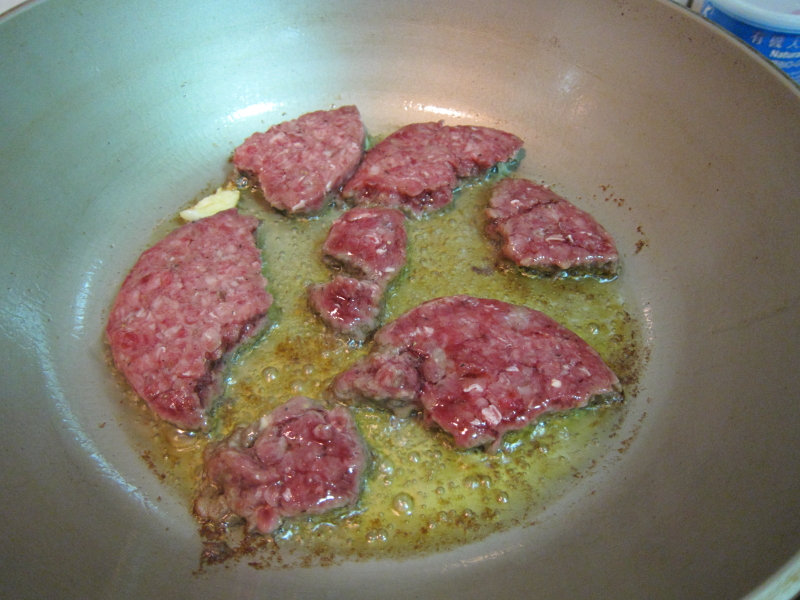 鍋中放入橄欖油燒熱,把漢堡排撕成幾片放入油煎,定型後翻面。