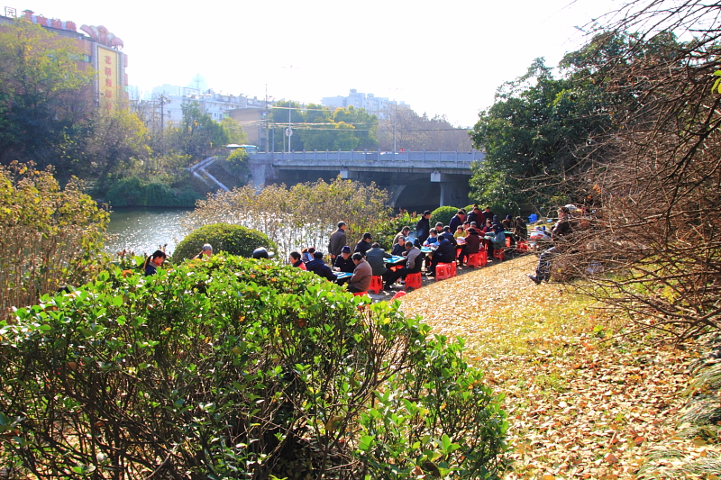 一走近河岸,就看到許多人聚集在岸邊的草地上,四個人一桌沐浴在太陽光底下,我正好奇他們在幹嘛?走近一看,原來是光天化日之下公然聚賭,在打麻將啊!