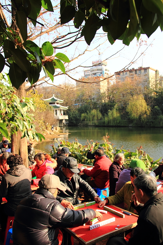 不過大陸的老人家真是悠閒,小日子過得挺好。兩岸對於打麻將的民情還真不同,在台灣打麻將都是在家裡打,而且大多是在晚上才開打,很少看到有人白天打牌,更別說在室外打。但在大陸我已經不止一次看到有人在室外打麻將,在戶外打麻將不會很冷或很熱嗎?如果突然下雨該怎麼辦?如果我摸起一張大三元混一色自摸的牌,正要推倒,結果突然天將大雨,另外三家見勢不對,拔腿就跑,那我這一把大牌該找誰收錢去?所以打牌還是在家裡打比較好吧!