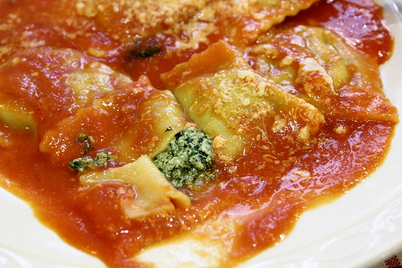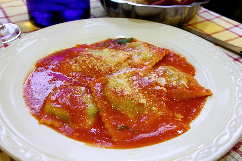點了在台灣很少見的義大利麵餃,搭配的是番茄醬汁,共有五大片餃子。
