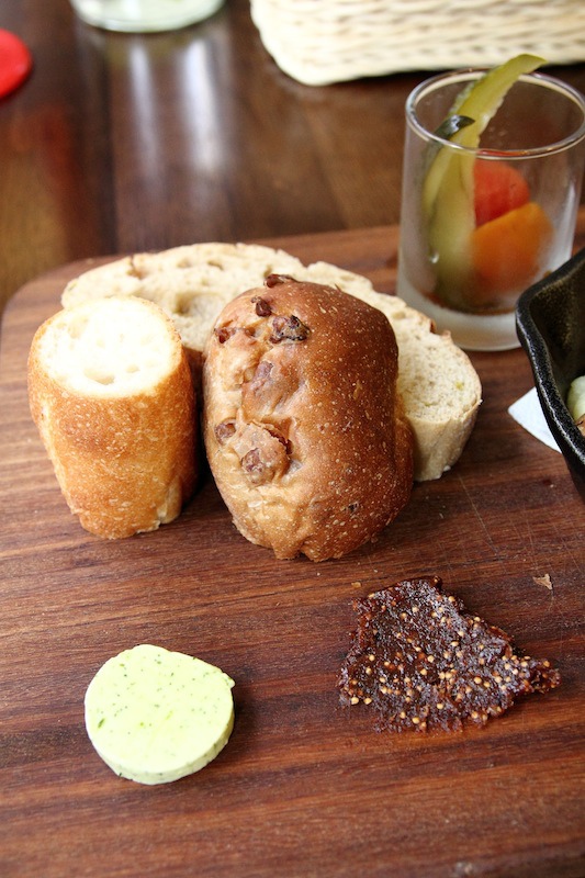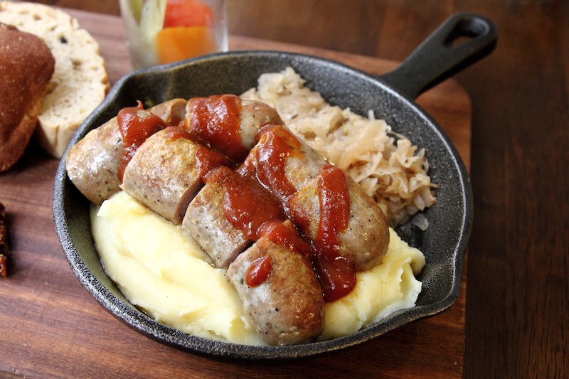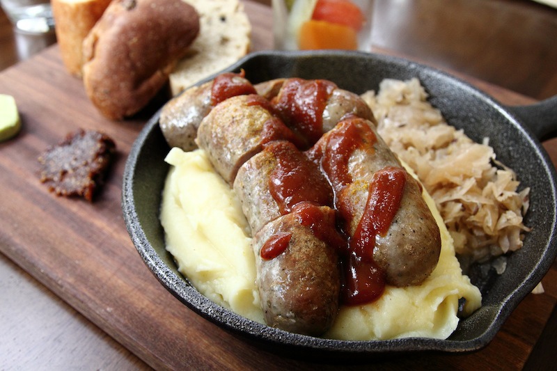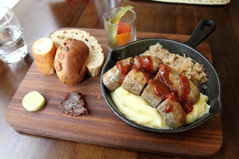 點了份香腸餐,可從四種配餐中選擇,我選的是馬鈴薯泥。小鐵鍋裡有香腸、酸菜與馬鈴薯泥,一旁附上香料奶油以及三種麵包,並有一小盅的酸黃瓜等漬物。