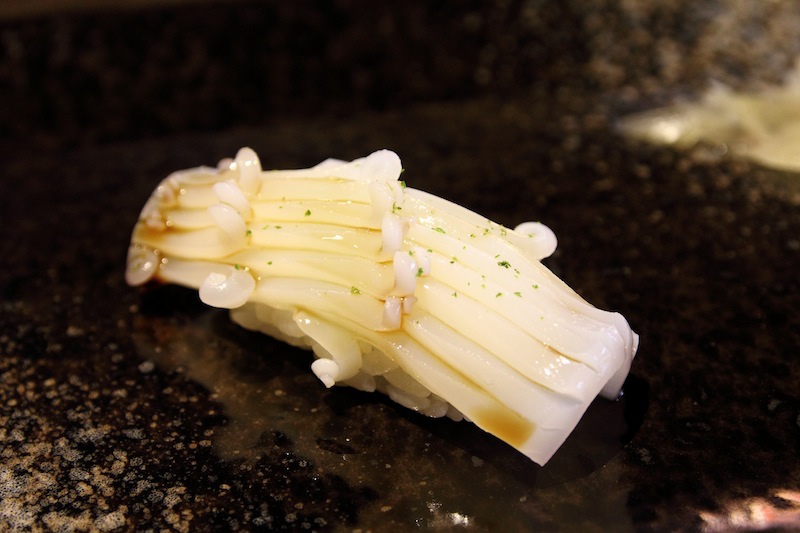 第一貫送上的是透抽握壽司,透抽切直刀紋,末端微微翹起。月酒居的握壽司也都調味好了,師傅握好壽司後會淋上醬油,因此也不需再自行沾醬,直接吃即可。透抽加了點紫蘇提味,口感軟潤鮮甜,溫度保持室溫不冰冷,醋飯亦是如此,微溫的溫度,不過米粒口感較硬也較黏,吃入口中比較不易散開。