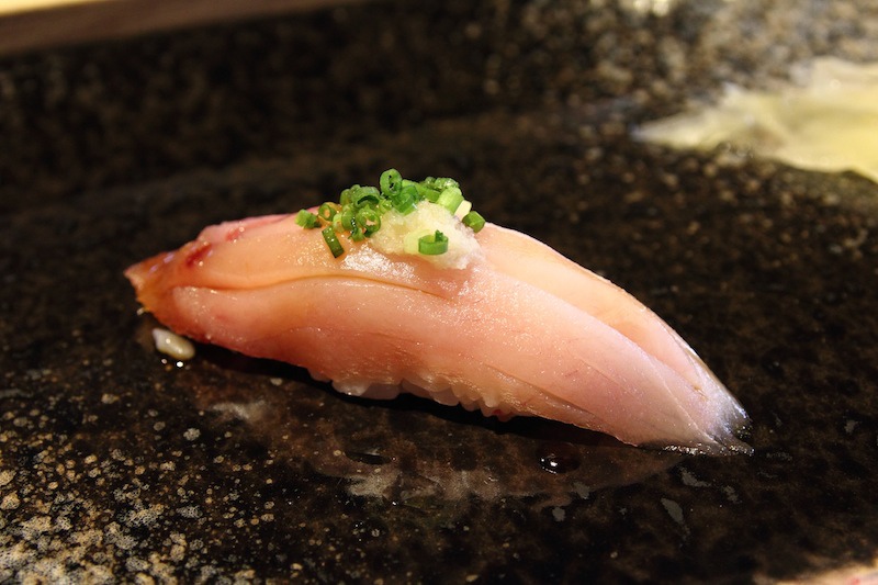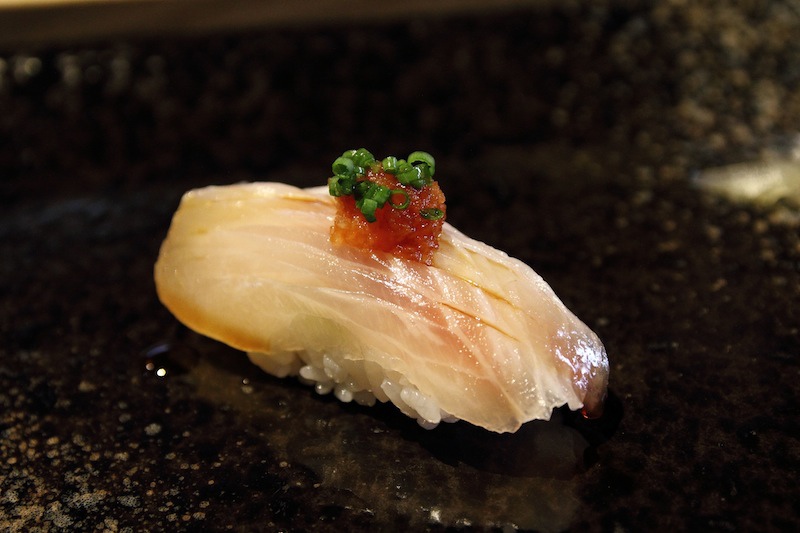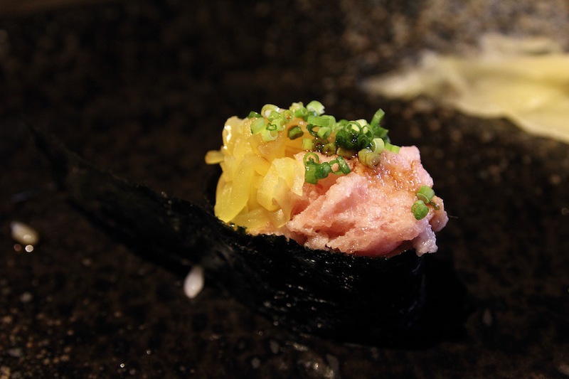 本以為握壽司只有三貫,沒想到又送上一貫軍艦。鮪魚泥與醃蘿蔔搭配,因此有兩種口感,軟膩與爽脆。剛入口時先吃到蘿蔔的脆,接著是鮪魚泥的綿密,甜味在魚泥化開之後慢慢浮現,只是油甜度也不那麼足,算是一般。