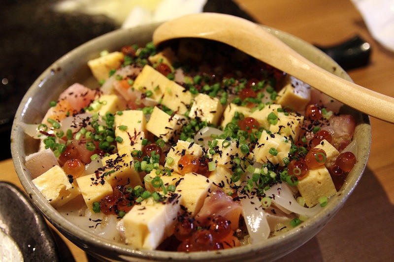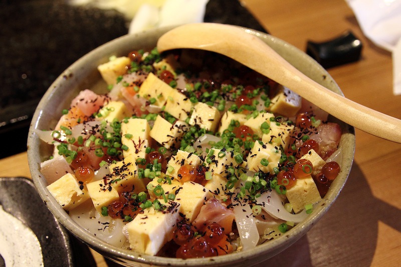 接著送上了散壽司,裡頭的魚料共有鮭鮪旗生魚三寶、透抽、鮭魚卵、玉子燒,皆切成小方塊狀。醋飯室溫溫度,已經調味過了,因此也不用再加醬油。只是同樣是較為黏硬,不易散開。眾多魚料與醋飯一同入口,軟嫩鮮鹹諸種滋味,相當令人滿足。雖然看起來不大碗,可其實挺有飽足感,或許也是因為醋飯比較扎實的關係。