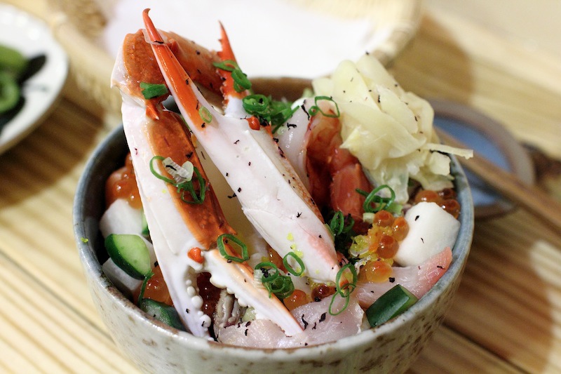 這道荒海散壽司丼在瞞著爹三店也有,因為吃過,所以倍感親切便點了這道。此外,服務員說今天只要加五十元便能加購蟹腳,既然如此就加一份吧。送上來的丼飯上擺著兩隻大蟹腳,把底下的魚料都給蓋住了。蟹腳僅把殼稍微敲開了些,所以還得自己把殼掰破,食用起來比較不方便,如果師傅可以順道把殼去掉,只剩蟹腳肉的話,相信會更貼心。雖然吃起來麻煩,不過蟹腳肉的確是多汁清甜,相當不錯的品質。