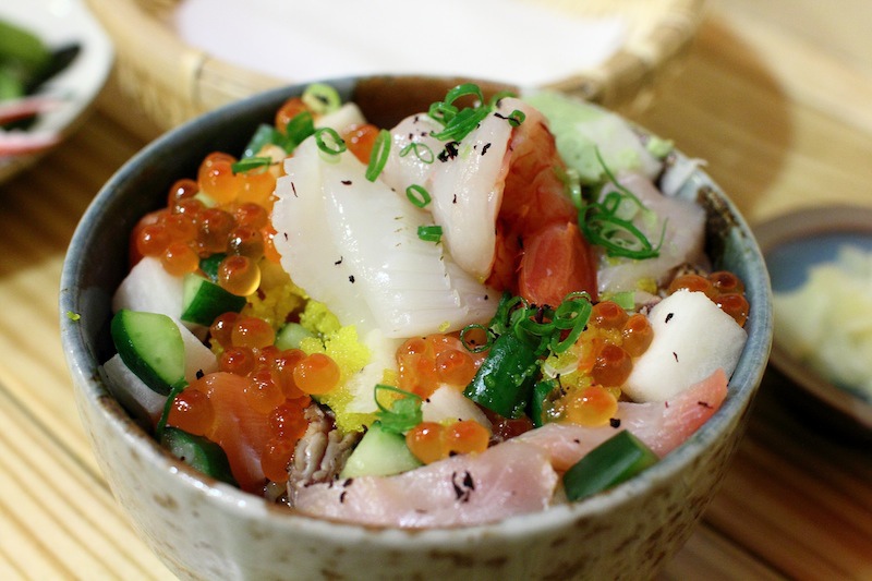 吃完蟹腳,見到底下的丼飯,魚料計有一片花枝和胭脂蝦,花枝彈嫩,相當地甜,品質很好。胭脂蝦黏滑,滋味也甜,可比牡丹蝦來說還是遜色一些。除了這兩個完整魚料之外,其餘的魚料如鮭魚、旗魚、海鱺等都切成小片處理,搭配鮭魚卵以及切成小方塊的山藥、蘋果與小黃瓜。因為上述三樣小方塊食材,所以整碗丼飯吃起來反而滿滿是爽脆的口感,魚肉的軟嫩口感容易被忽略。搭配的是微溫的醋飯,已經加了些醬油調味,不需再加醬油。米粒偏濕軟,黏性比較大一些,魚料則都頗為新鮮甜嫩。以這個價位來說,可說是料好實在,經濟實惠,可說是低價版的瞞著爹三店吧。