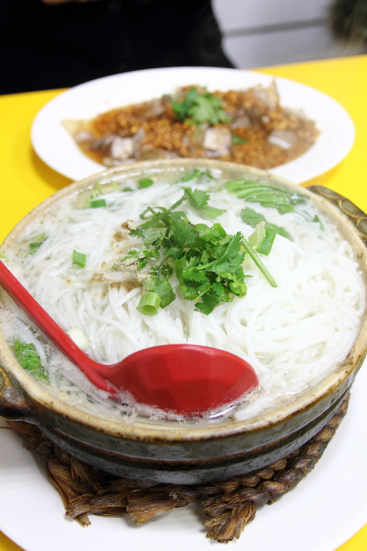砂鍋裝盛的米線,上桌時仍然滾燙冒泡,份量不小,一份足夠兩人吃。表面放滿了滑嫩的米線,底下暗藏豬肉、豬肝、小豆苗等蔬菜。米線滑溜軟嫩,湯頭甘甜中帶有豆苗與蔬菜的清香,爽口不油膩,味道挺好的一鍋米線,吃的也飽足。