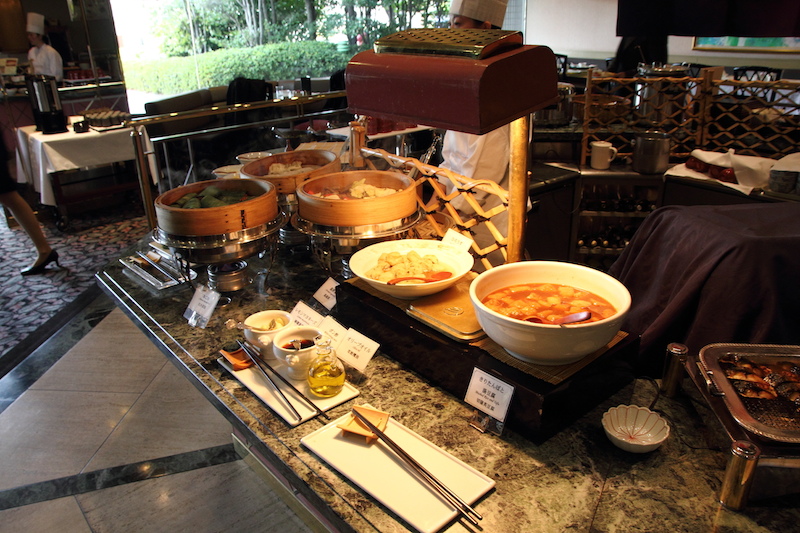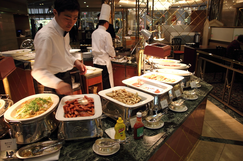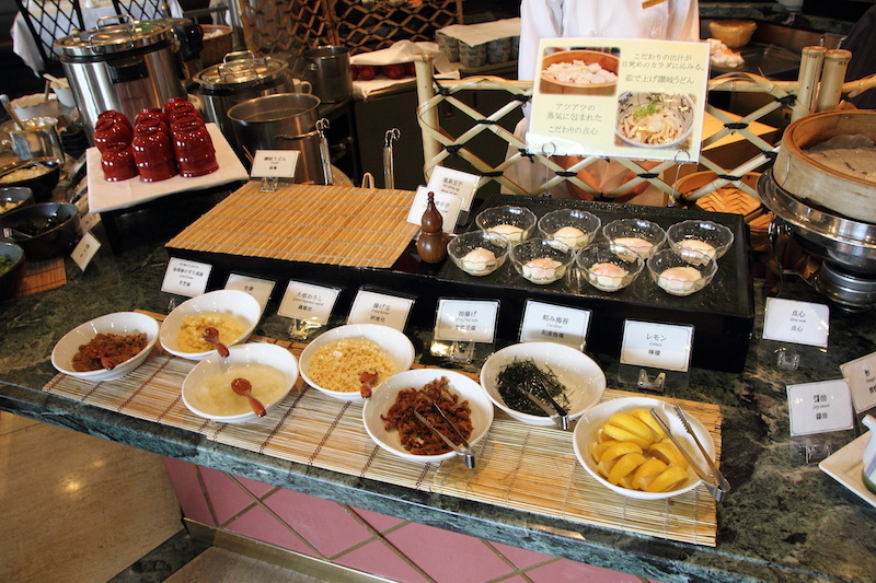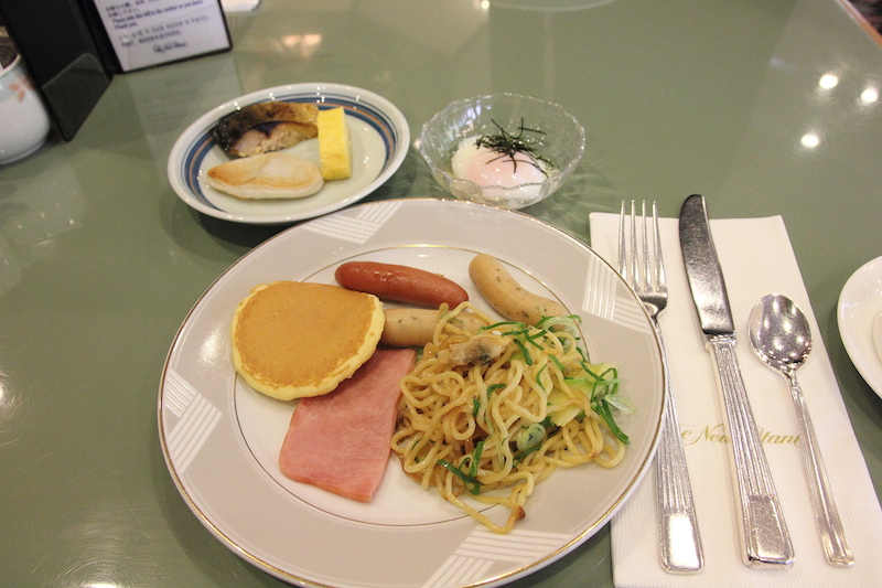 新大谷的自助式早餐非常豐盛,主要分為兩個區塊,一邊是西式早餐;另一邊則是日式早餐。西式早餐就與一般飯店常見的大同小異,以生菜沙拉、麵包、香腸、培根、現作蛋捲為主。日式早餐就比較特別了,有現煮的烏龍麵、清粥以及日式漬物、味噌湯與烤魚等,喜歡吃什麼就看個人選擇了,也可以和洋合併一起吃。不過相較於西式的選擇,日式的早餐算是比較少一些,不過兩邊的餐點都不錯吃。