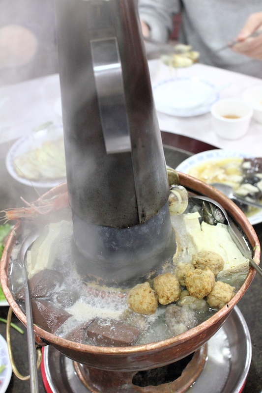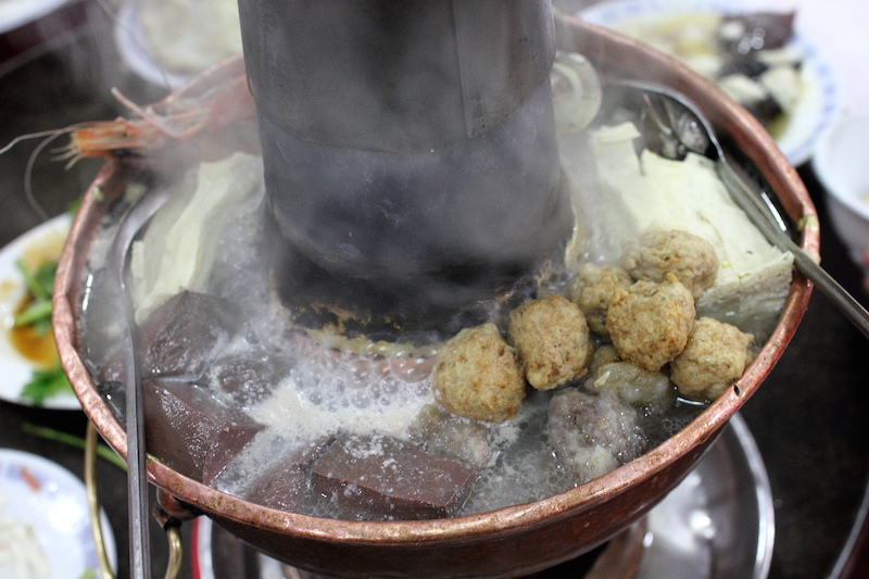 鍋中的料有丸子、排骨酥、豆腐、粉絲、白肉、酸菜、蛤蜊、蝦子、豬血等,酸氣很重,鍋中不斷傳出一股酸溜味。比較可惜的是白肉好像是整團結凍的下鍋底煮,撈起來時都黏成一塊,肉質偏軟,沒什麼口感。值得讚賞的是酸菜湯底,酸味剛剛好,解膩又清甜。