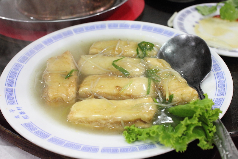 我發現台北北方菜館的鍋塌豆腐似乎家家有不同的作法,稻香村的是豆腐夾點碎肉末裹漿油炸,然後淋上薑絲勾芡湯汁,讓豆腐外溜上一層濃稠滑膩的湯汁,吃起來更為滑嫩,雖然風味清淡,但卻蠻清新可口。
