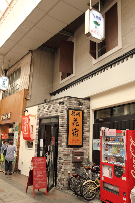 福岡花宿位於中洲川端地鐵站附近,就在上川端商店街的南側出口,靠近櫛田神社,交通還算方便,從地鐵站走過來大約十分鐘。其實看到福岡花宿的地點有點訝異,第一次見到日本的Hostel是開在商店街裡,之前住的Hostel通常都是在寧靜的住宅區裡。不過在商店街也有好處,附近左右幾乎都是餐廳,而且大多營業至深夜。如果不想在這裡吃東西的話,往旁邊走過一座橋就是中川,福岡夜生活的所在地,再走約十分鐘就可到屋台區。