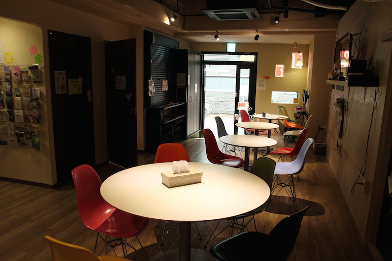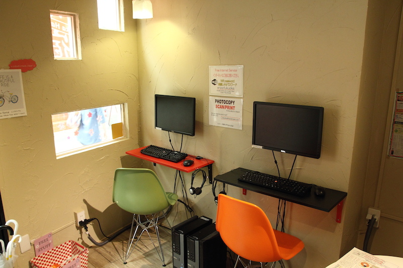 福岡花宿的空間不算太大,初看之下還以為是咖啡店,走進室內,右手邊是櫃台,左邊則是交誼廳的功能,設有幾張桌椅,也可以在此使用電腦,全館提供無線網路,密碼在櫃台處。