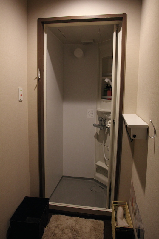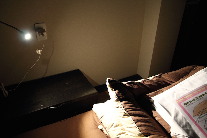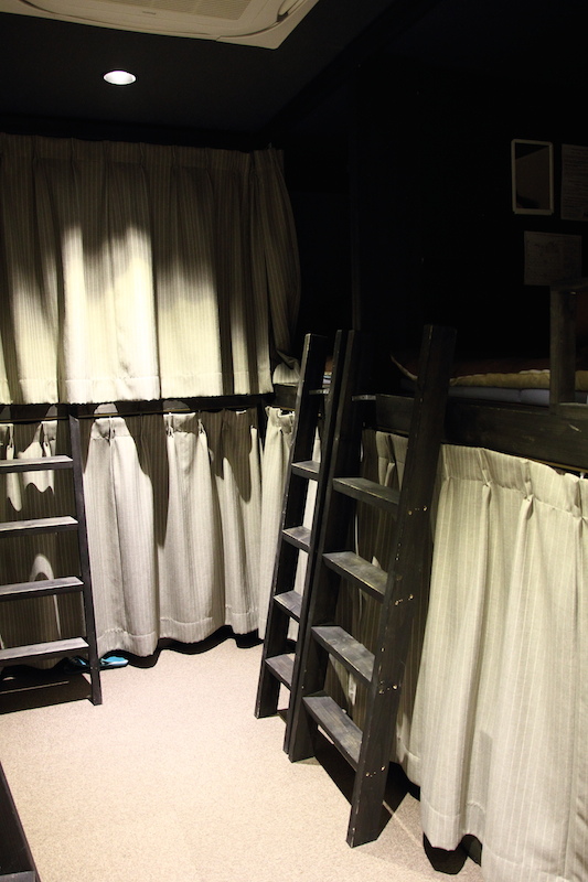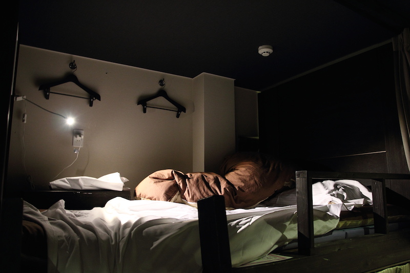 這家的房間燈光比較暗沉,雖然也是上下舖,但是床架非常厚實,是很扎實的厚木頭,非常地穩,不會搖來搖去。而且床鋪空間很大,除了床墊之外,床墊旁還有一條空間可以置物,並且放了一個小檯子可以用來使用電腦等物品,附有一個小夜燈,床鋪還有拉簾可以拉上,隱密性較高,這與京都花宿的設置一樣,相當貼心。