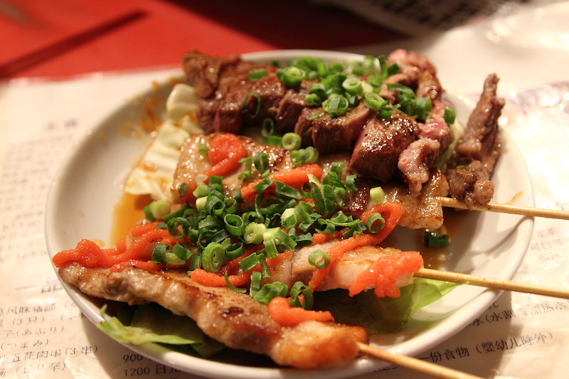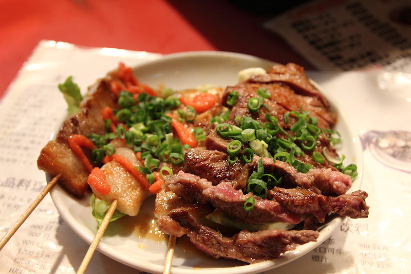 雖然是屋台,但價錢可不像台灣路邊攤那樣便宜,其實就與一般店面的價格差不多。先來了一份三串的明太子五花肉,五花肉彈嫩鮮甜,搭配鹹辣的明太子醬相當對味,不過口味也略重了點,看來在屋台還是得點啤酒才行,配著吃才不會太鹹。牛舌烤的熟度適中,中間還夾著粉嫩,口感相當有彈性,但少數幾塊有點韌,不太好咬。